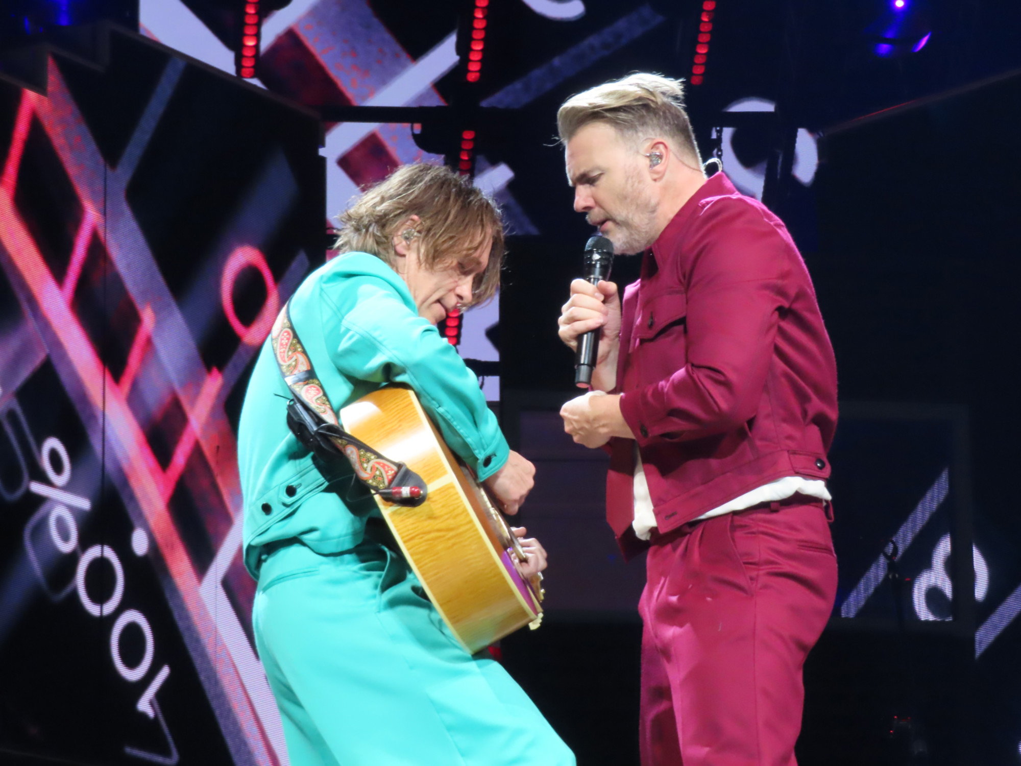 C’était pour moi un concert mi-figue mi-raisin , mais pas à cause des garçons. Eux, ils ont été au top, comme toujours ! Pour commencer j’ai été très déçue de l’accueil. Comme je vais avoir 40 ans cette année, mon compagnon a décidé de casser la tirelire et on s’est fait plaisir en achetant des billets VIP avec le goodie bag inclus. J’ai reçu pleins de mails du tour operator et de la salle disant qu’on vivrait une super expérience, qu’on aurait un accès anticipé à partir de 16h30, qu’on aurait accès à une lounge dédiée, un placement personnalisé, blablabla. Et… Rien de tout ça. On est entré dans le centre commercial du O² comme tout un chacun, on nous a dirigé vers un petit espace derrière les escaliers roulants et si on n’avait pas vu une personne portant un t-shirt de la tournée, on aurait pu croire que c’était les vestiaires ou même un pressing. Mini déception du goodie bag également car il était précisé qu’il y aurait un souvenir spécial unique à la ville et j’ai rien vu qui soit estampillé « London » ou différent des goodies bag d’autres villes que j’ai vu passé sur les réseaux (mais c’est peut être moi qui n’ai pas compris) , mais en dehors de ça je le trouve extra et puis ça fait des souvenirs en plus pour la collec’ Mais j’en reviens à la salle. Donc déjà on a pu y entrer qu’à partir de 18h30, pour accéder aux coursives, et j’ai jamais vu autant de gens picoler lors d’un concert. Ce n’est pas mon premier concert de Take That à Londres (j’avais fait la tournée Circus à Wembley). Sérieusement, les gens autour de mois en tenaient déjà une bonne couche avant même que la première partie ne soit commencée (j’ai adoré l’énergie d’Olly Murs, au passage) , y’a même une dame, j’ai cru qu’elle allait faire un vol plané dans les escaliers tellement elle tenait plus debout. Et tout le long du concert, ça m’a choqué de voir les gens faire des aller-retour constants au bar… Les sièges étaient ultra serrés également, j’ai vu plusieurs personnes assez corpulentes être obligées de rester « mi-assis » sur le bord du siège non-abaissé pour pouvoir profiter du spectacle. Au prix du billet, je trouve ça honteux que les places les plus chères ne soient pas un peu plus large. J’ai été étonnée de voir que c’était des places assises dans la fosse. En dehors du concert au Grand Rex où il n’y a pas de fosse à proprement parlé, tous les concerts du groupe auxquels j’ai assisté avait une fosse debout. Je ne sais pas si c’est un choix des garçons pour la tournée ou si un choix de la salle. Bref, pour tout ce qui est autour du concert, vu le prix que ça m’a coûté, j’ai été déçue de l’expérience qui n’a absolument pas tenu ses promesses par rapport à tout ce qui a été dit dans les nombreux mails que j’ai reçu.